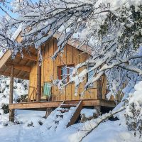 Une mezzanine accueille un lit 2 places et au rez de chaussée la cabane est équipée d’une cuisinette, d’une table pour manger, d’un rangement pour les habits, d’un petit bureau et d’un lit simple qui fait aussi office de canapé. Sans oublier la salle d’eau avec toilettes, douche, lavabo.