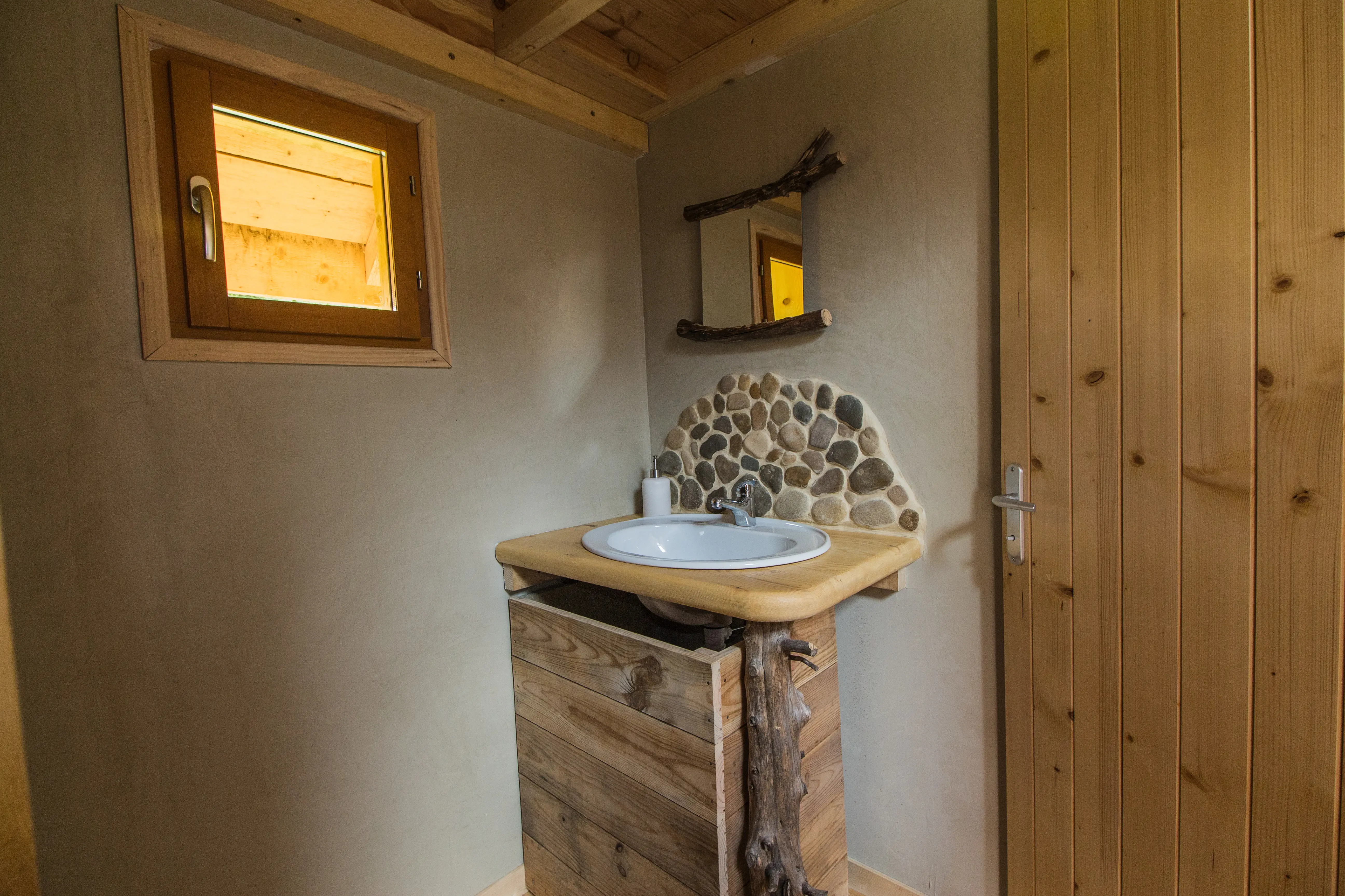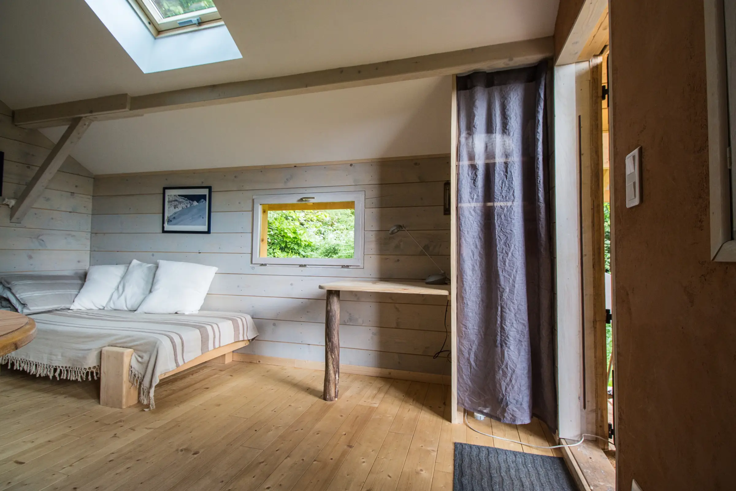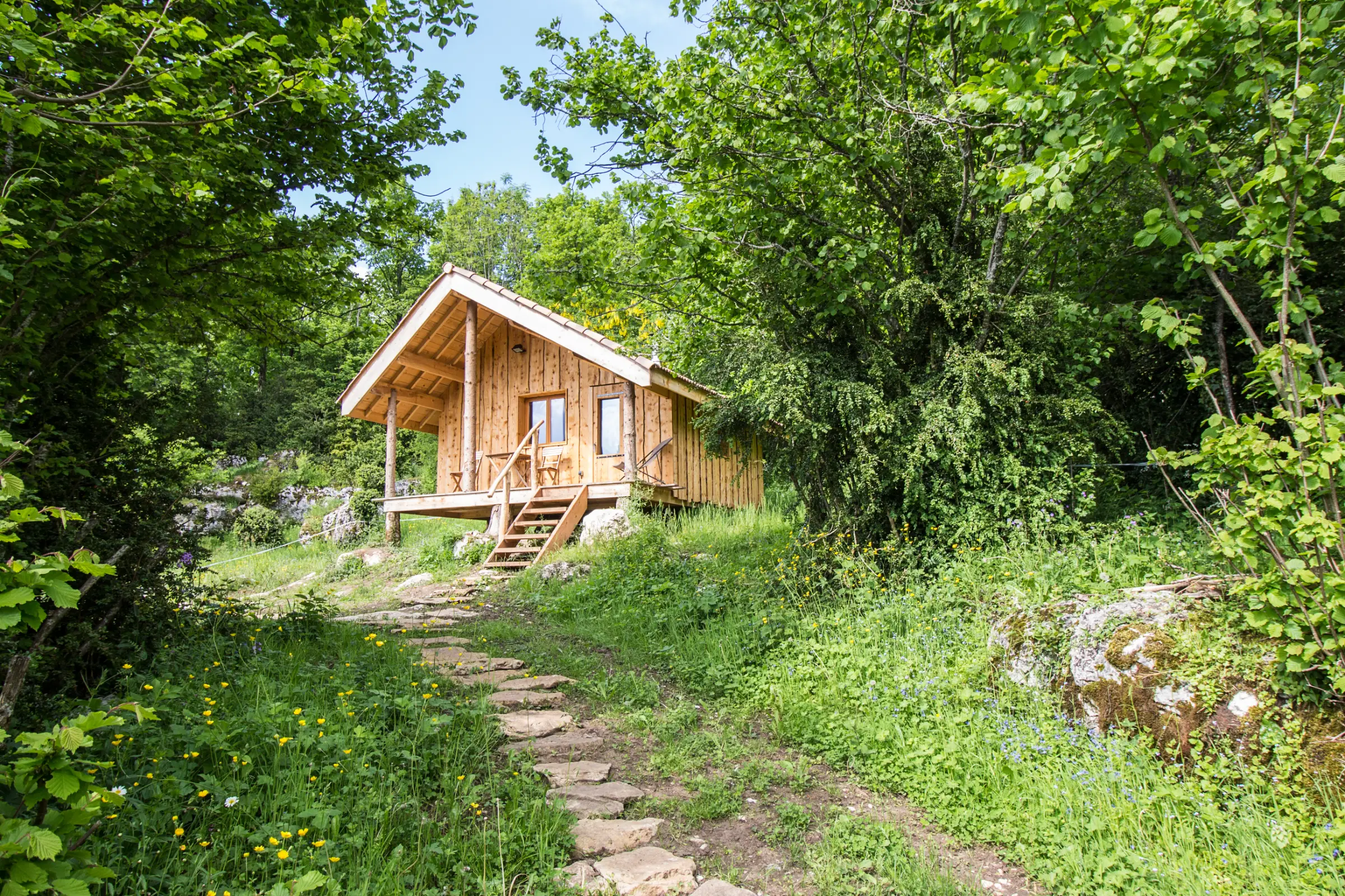 Cette jolie cabane est posée dans une petite prairie qui surplombe la maison familiale. Elle a été conçue entièrement avec des matériaux écologiques. Très bien isolée, elle se chauffe rapidement avec son petit poêle à bois. Elle est donc très confortable aussi bien l’été que l’hiver.