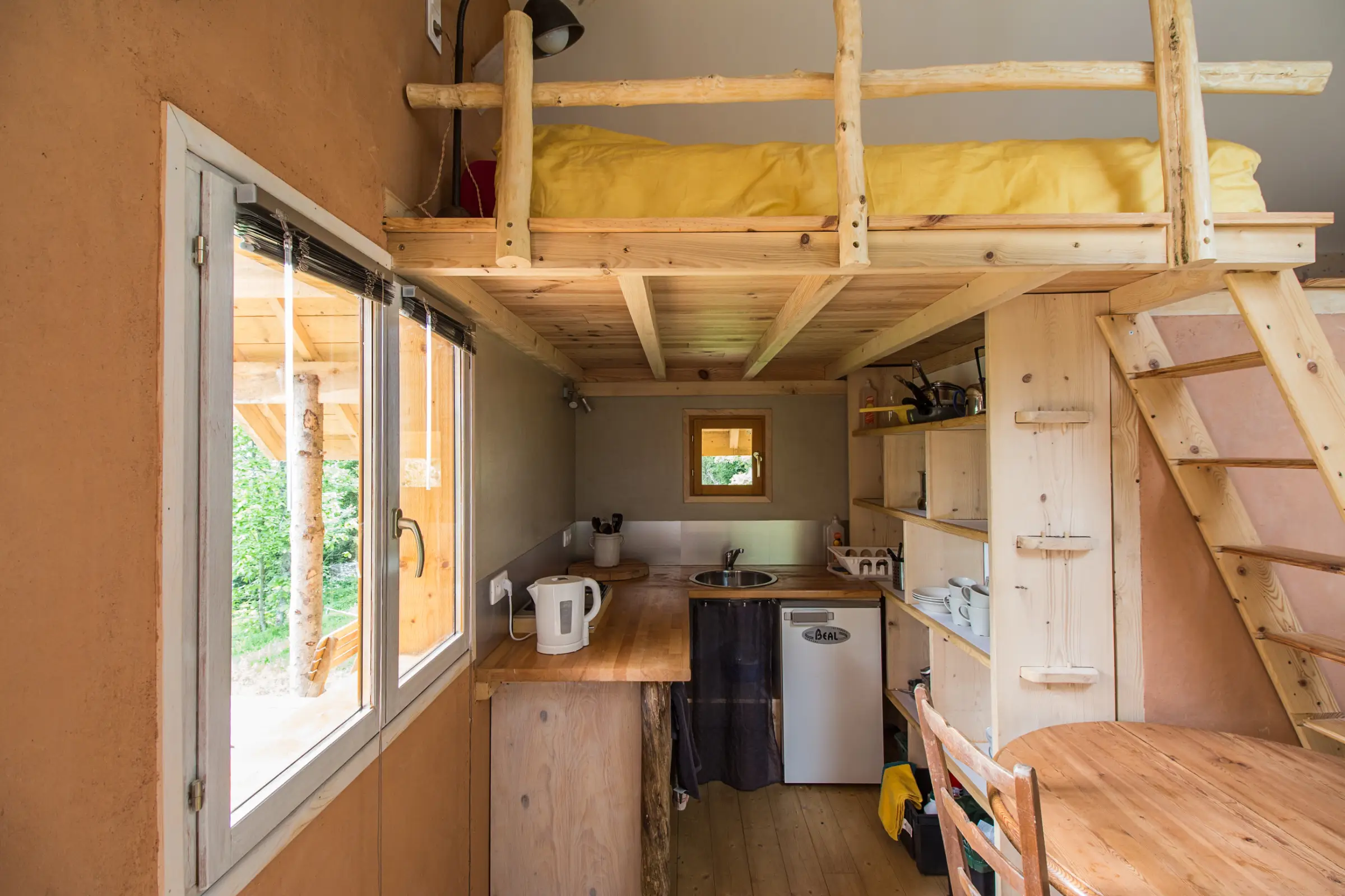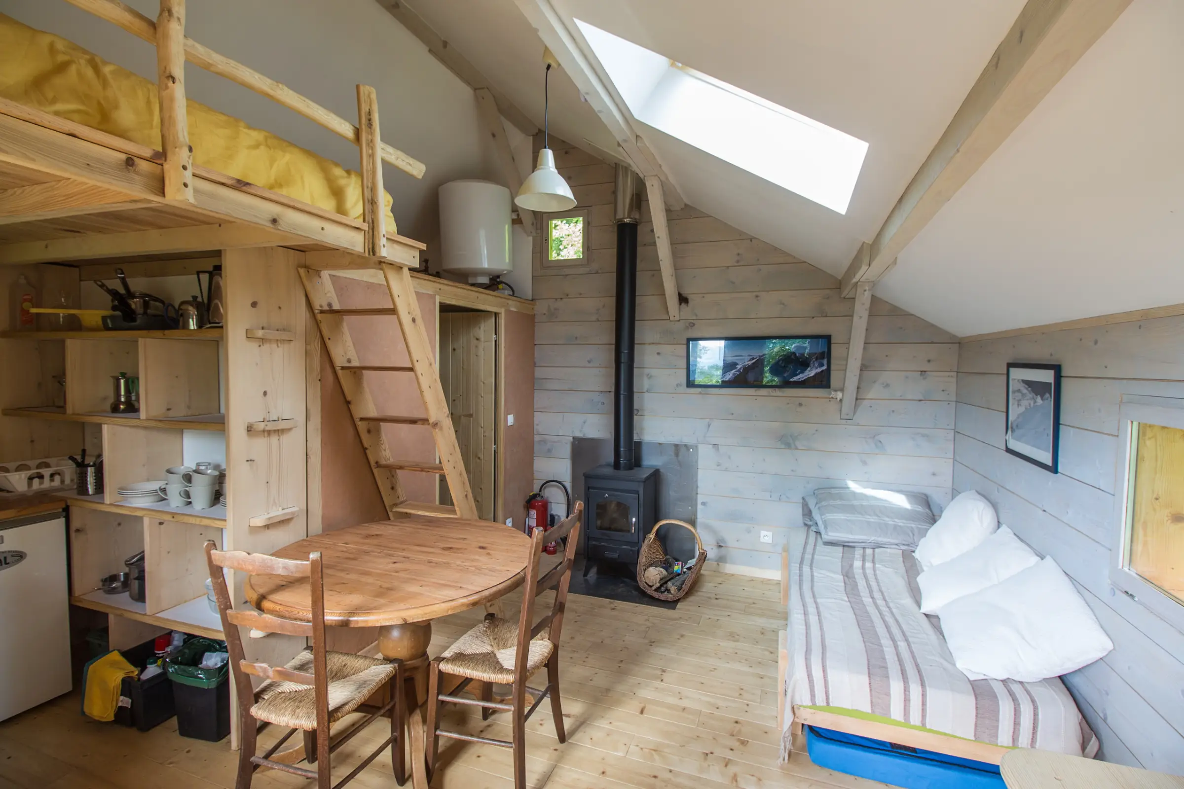 Une mezzanine accueille un lit 2 places et au rez de chaussée la cabane est équipée d’une cuisinette, d’une table pour manger, d’un rangement pour les habits, d’un petit bureau et d’un lit simple qui fait aussi office de canapé. Sans oublier la salle d’eau avec toilettes, douche, lavabo.
