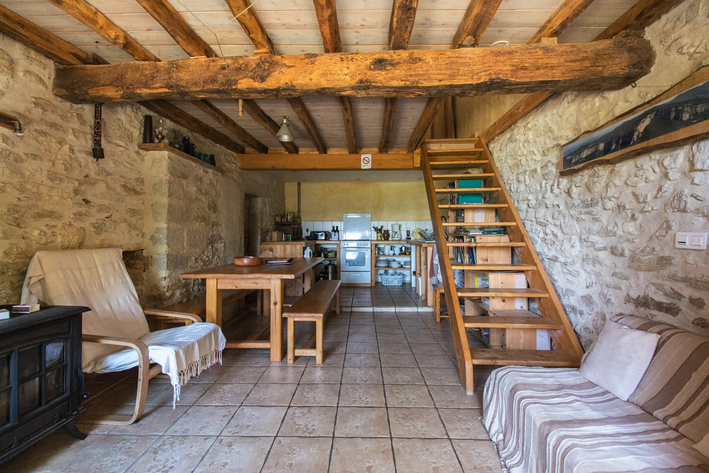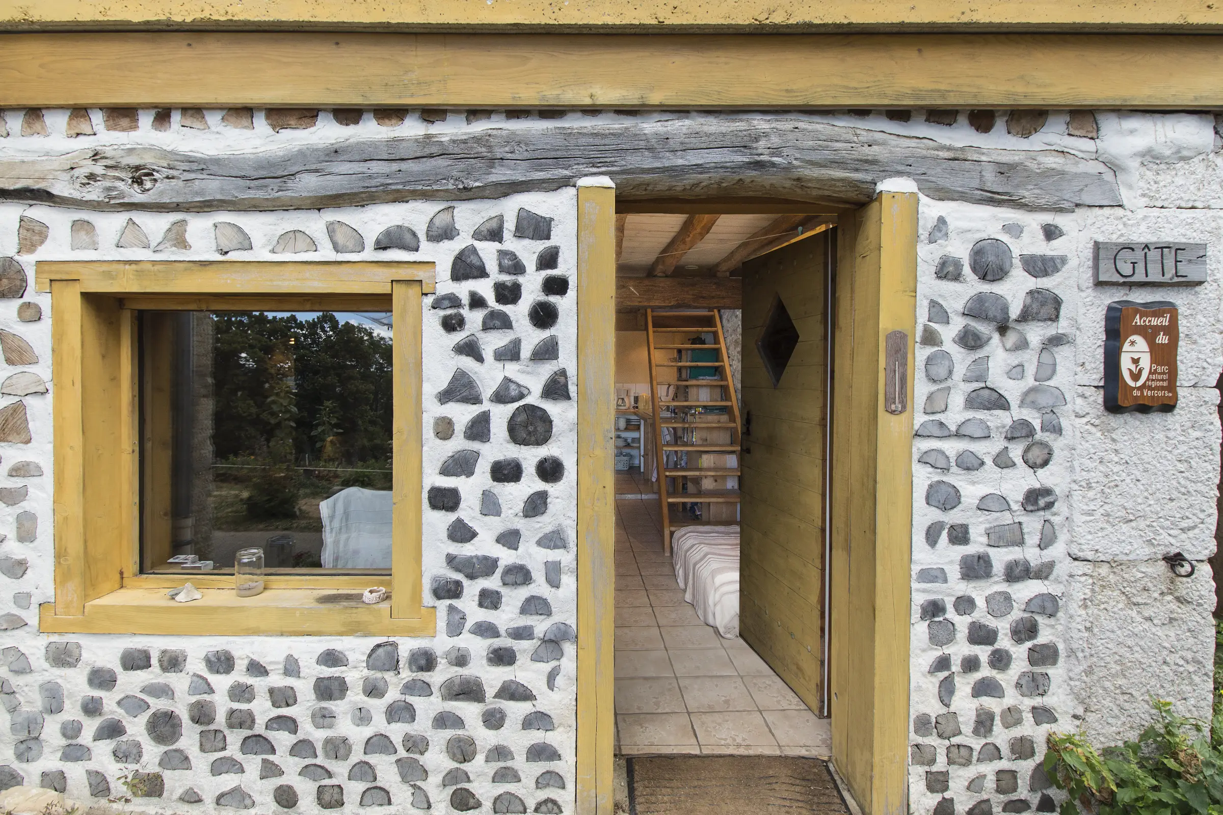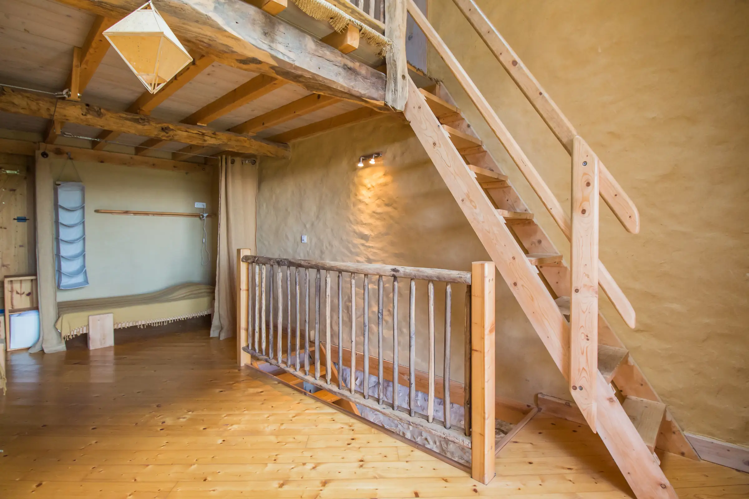 Le gîte a 3 niveaux. La porte d’entrée (fierté du propriétaire!) pivote sur des gonds en bois. Elle donne accès à la salle de séjour. Un poêle à bois vous y attend devant lequel vous pourrez vous détendre ou lire un bon livre.